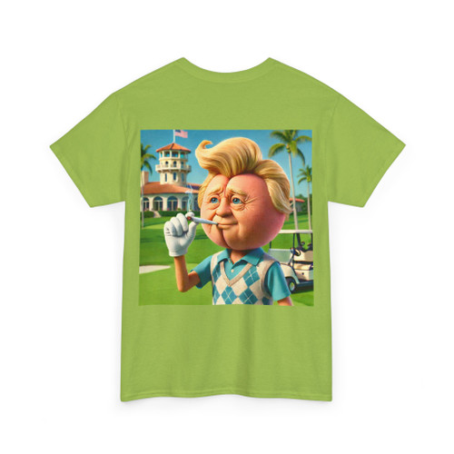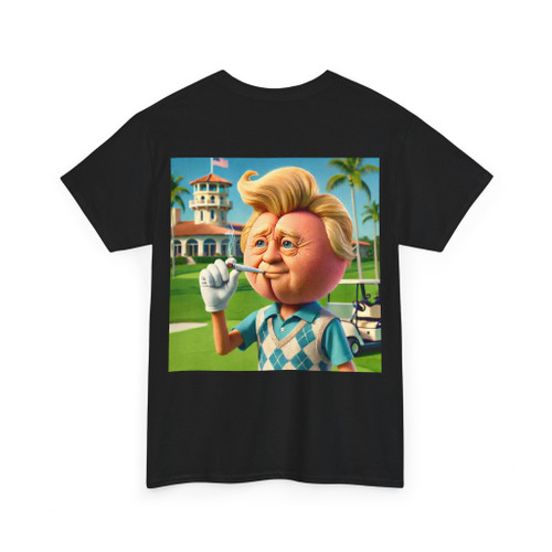 Meet our Golfer — combover swept back, golf glove on, and joint raised with a smug grin while a pristine country club fairway and golf cart stretch out behind him.
